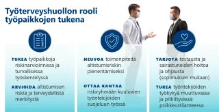 - ehdottamalla toimenpiteitä yhteistyössä työpaikan kanssa altistumisriskin pienentämiseksi ja turvallisen työskentelyn varmistamiseksi.