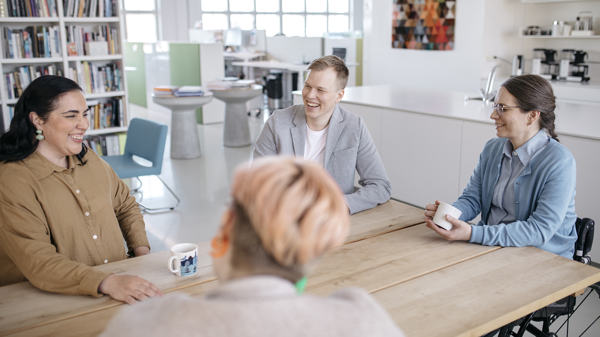 Neljä henkilöä keskustelee kahvipöydän äärellä.