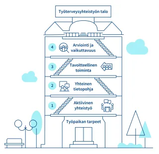Työterveysyhteistyötä voidaan kuvata talona. Työterveysyhteistyön talossa on neljä kerrosta, jotka kuvaavat työterveysyhteistyötä prosessina. Kerroksia yhdistävät rooleja ja vastuita kuvaavat portaat. Talon perustana toimivat työpaikan tarpeet. Talo pysyy pystyssä, kun kaikkia kerroksia kehitetään yhdessä.