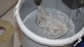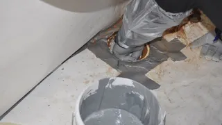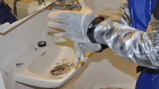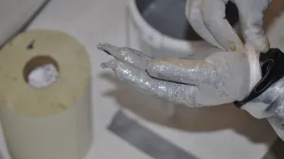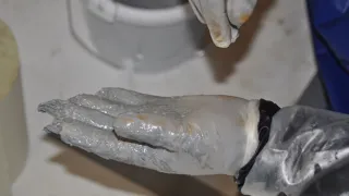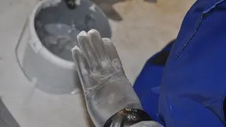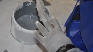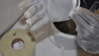 Hyvin likaavassa työssä voidaan käyttää useita käsineitä päällekkäin, jotta estetään ympäristön tahriintuminen. Kuvasarjassa pinnoitetaan kylpyhuoneen lattiakaivoa.