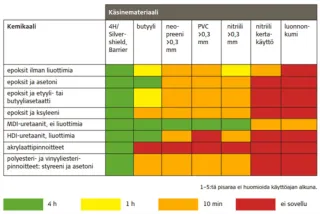 Käsinemateriaalin tulee suojata käsitellyiltä kemikaaleilta (tietoa löytyy käyttöturvallisuustiedotteesta tai tästä ohjeesta).