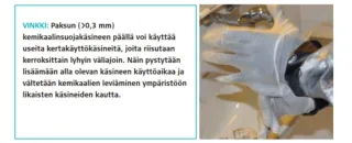 Alimmaiset kemikaalinsuojakäsineet vaihdetaan vähintään kerran päivässä.