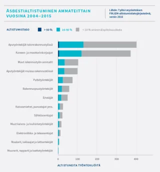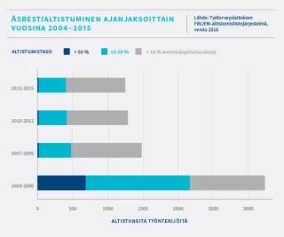 Työterveyslaitoksen FINJEM-altistumistietojärjestelmän arvioiden mukaan yli tuhat työntekijää saattaa Suomessa edelleen altistua asbestille, vaikka asbestin uuskäyttö on kielletty ja asbestipurkutyöt ovat luvanvaraisia. Pitoisuustasot ovat kuitenkin selvästi aiempaa alhaisempia (kuvat 1 ja 2).