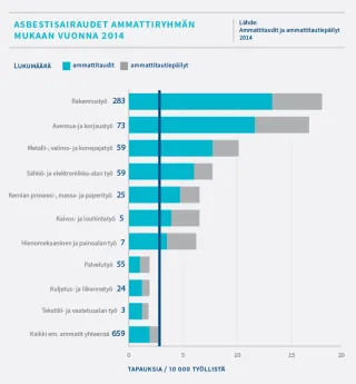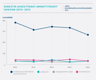 Vuonna 2014 Työperäisten sairauksien rekisteriin (TPSR) ilmoitettiin 659 asbestin aiheuttamaa ammattitautia ja ammattitautiepäilyä. Niistä ammattitaudeiksi vahvistettiin 69 % eli 454 tapausta. Asbestiin liittyvistä ammattitaudeista ja ammattitautiepäilyistä 94 % kirjattiin miehille, joista 68 % oli yli 65-vuotiaita. Yleisin asbestin aiheuttama ammattitauti tai sen epäily oli pleuraplakit, joita kirjattiin 413 tapausta, ja epäiltyjä hengityselinten syöpiä kirjattiin 88 tapausta. Vahvistetuista asbestin aiheuttamista ammattitaudeista 338 oli pleuraplakkeja, 35 asbestooseja, 38 asbestin aiheuttamia hengityselinten syöpiä ja 40 mesotelioomia (kuva 3).