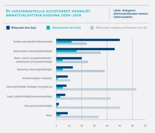 Kuva 2. Isosyanaattien aiheuttamat ammattitaudit ammattiluokittain. Lähde: Työperäisten sairauksien rekisteri, Työterveyslaitos.
