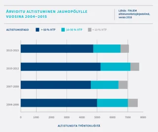 Työterveyslaitoksen FINJEM-altistumistietojärjestelmän arvioiden mukaan jauhopölylle altistutaan edelleen yleisesti. Viimeisimmässä arviossa (2013-2015) jauhopölylle altistuvia oli kaikissa ammattiryhmissä yhteensä yli 7000. Altistuvien lukumäärä ei ole laskenut samassa suhteessa kuin työntekijämäärä on vähentynyt. Jauhopölylle altistuvien kaikkien ammattiryhmien arvioituja altistumisen muutoksia eri altistumistasoilla voi tarkastella kuvassa 2.
