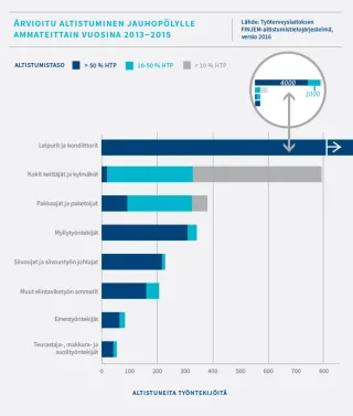 Ylivoimaisesti suurin jauhopölyille altistuva työntekijäryhmä on edelleen leipurit ja kondiittorit. Vuosien 2013-2015 FINJEM-arvion mukaan noin 5000 eli noin 80 % alalla työskentelevistä altistui jauhopölylle ja näistä noin 4000 pitoisuuksille, jotka olivat yli puolet HTP-arvosta (Kuva 3).