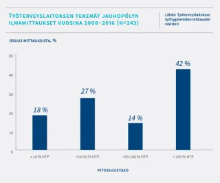 Jauhopölypitoisuudet vaihtelevat eri työpaikoissa ja työvaiheissa. Mittauksista noin 56 % oli yli puolet HTP-tasosta ja 42 % ylitti HTP-tason 2 mg/m3 (Kuva 1).