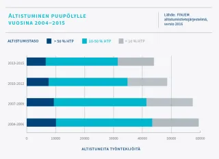 Työterveyslaitoksen FINJEM-altistumistietojärjestelmän arvioiden mukaan puupölylle altistuvien määrä on laskenut 2000-luvulla, mikä johtuu pääosin työntekijämäärän vähenemisestä (Kuva 2). Vuosina 2004-2006 puupölylle altistuvia työntekijöitä arvioitiin olevan lähes 60000. Vastaava määrä vuosina 2013-2015 oli noin 45000 työntekijää. Merkittäville – yli puolet HTP-arvosta 2 mg/m3 – puupölypitoisuuksille altistuvien määrä on vähentynyt vuosina 2004-2015 noin 10000 työntekijästä vajaaseen 7000 työntekijään.