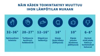 Infografiikkaa: Näin käden toimintakyky muuttuu ihon lämpötilan mukaan: 32–36° Optimaalinen toiminta, 20–27° Tarkkuus jakestävyys heikkenevät, 12–16° Näppäryys heikentyy, 16° Kipuja (koko käden jäähtyessä), 10° Kipuja (pienen ihoalueen jäähtyessä), 6–8° Hermot eivät johda tietoa ja tuntemukset katoavat.