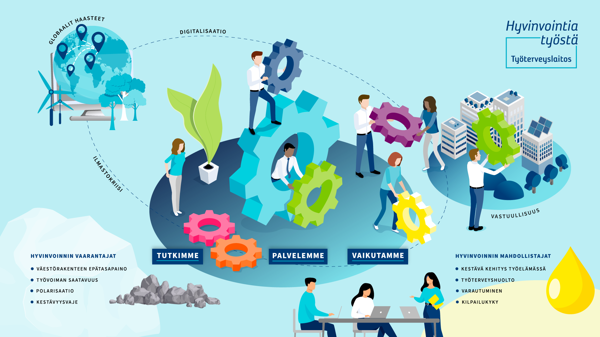 Siksi me Työterveyslaitoksessa edistämme työterveyttä eli työyhteisöjen ja yksilöiden kyvykkyyttä ja mahdollisuuksia toimia muuttuvan työelämän erilaisissa tilanteissa. Näin vaikutamme siihen, että työelämän laatu ja työn tuottavuus paranevat sekä työhön osallistuminen lisääntyy.