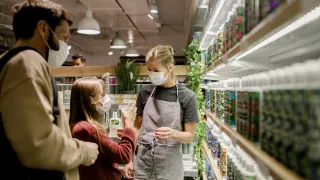 Palvelualan kassatyötä tekevä nainen maski kasvoilla