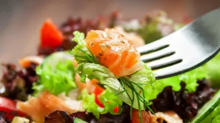 Lohisalaatti, joka sisältää jäävuorisalaattia ja pehtoorin salaattia, tomaattia, kurkkua, avokadoa, keitettyä kananmunaa, kylmäsavulohta, pinjansiemeniä ja hieman öljypohjaista salaattikastiketta. Ateriaa täydentävät rasvaton maito tai piimä sekä pala pala ruisleipää, jonka päällä on pehmeää margariinia.
