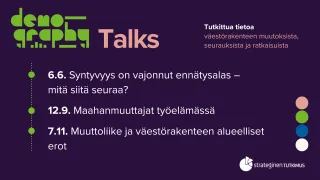 DEMOGRAPHY Talks -webinaarisarja tarjoaa tutkittua tietoa väestön muutoksista. Webinaarit ovat tiiviitä, alle tunnin mittaisia tilaisuuksia, joissa tutkijat esittelevät kahta ajankohtaista tutkimusta väestöön liittyvistä aiheista. Webinaarit konkretisoivat parhaillaan käytävää yhteiskunnallista keskustelua ja antavat siihen uusia näkökulmia. Webinaarissa esiteltäviä tutkimuksia rahoittaa strategisen tutkimuksen neuvosto, joka toimii Suomen Akatemian yhteydessä.