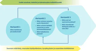Keskeistä on, miten hyödynnämme toimivia kehittämisen menetelmiä yhdessä – digitaalisesti tai muuten. Tutustu yhteen kehittämisen menetelmään ja ota käyttöösi kolmen horisontin malli.